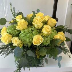 Price: $125.00Yellow roses green hydrangea, cube